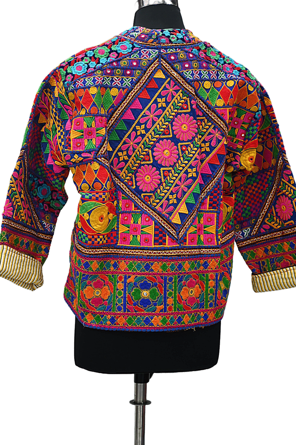 - 🧵 Pattern: The jacket features a diverse array of geometric and floral patterns created through a combination of patchwork and detailed embroidery.