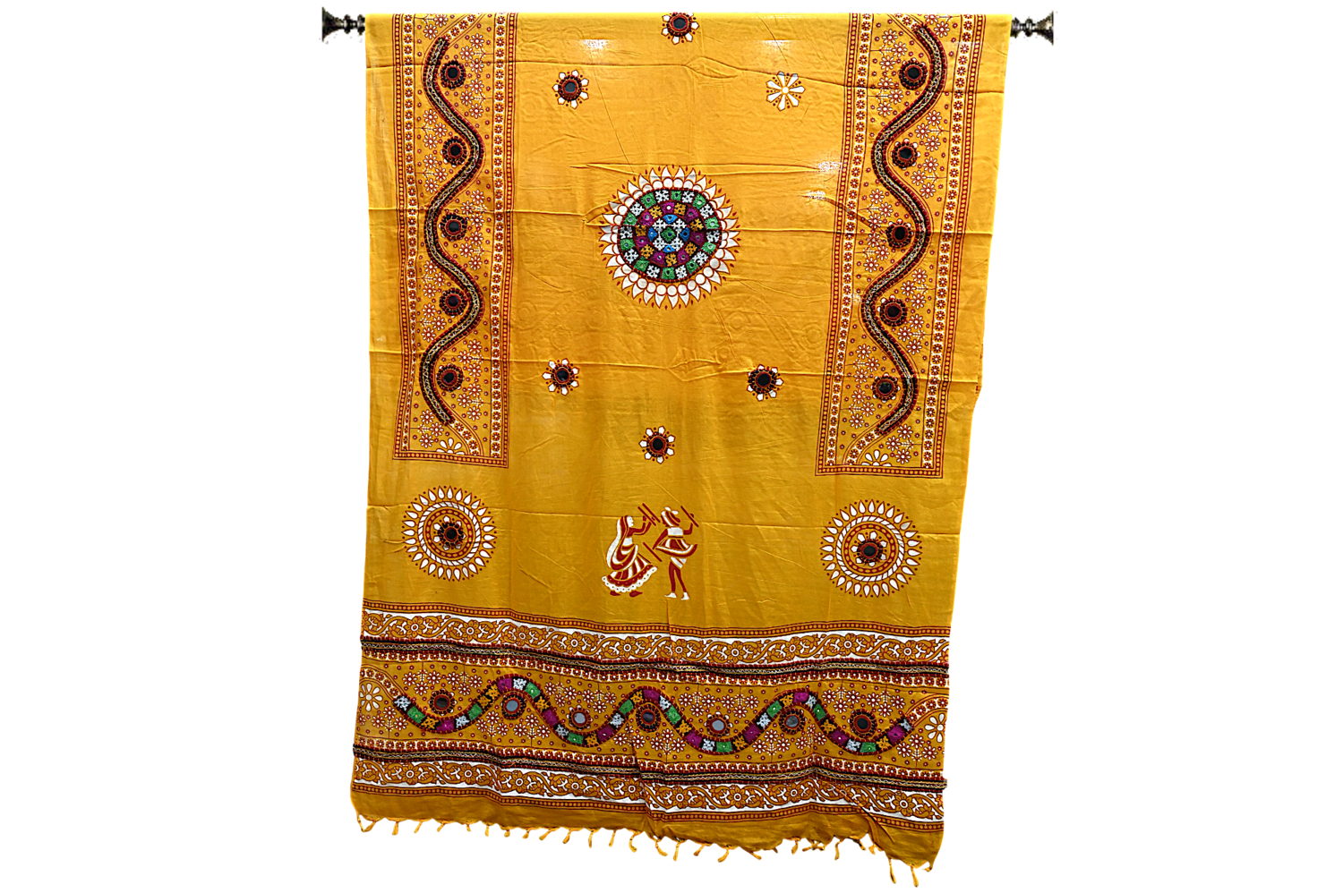 - 🪡 Border: Intricate Embroidered Bands with Mirror Detailing and Tassel Fringe